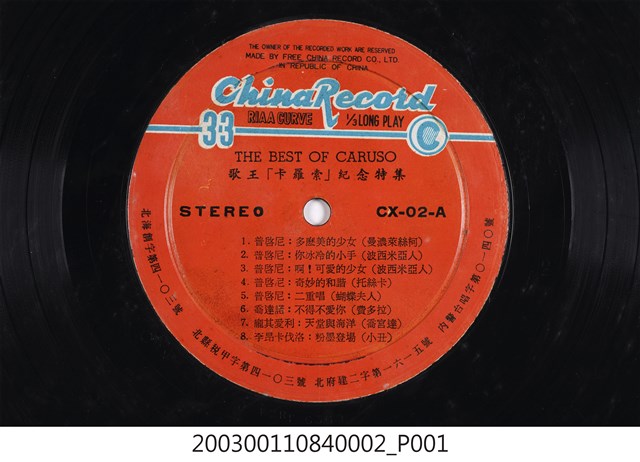 2003.001.1084.0002 中國唱片公司發行編號「CX-02」套裝西洋歌曲專輯《卡羅索紀念特集》第2片10吋塑膠唱片