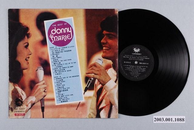 關於奧斯蒙兄妹的照片關於奧斯蒙兄妹在臺灣的電視演出與公演,請參考館藏編號「2003.048.0014」之文字敘述。這張專輯歌曲選自奧斯蒙兄妹先前發行的兩張暢銷專輯,分別為1974年的"I'm Leavin' it All up to You"以及1976年的"Donny & Marie Featuring Songs From Their Television Show" 兩張專輯的精選,在奧斯蒙兄妹發行唱片中當時並沒有這張精選集,推測可能是山水唱片公司特別選集、或其他翻版唱片製作的臺版唱片。