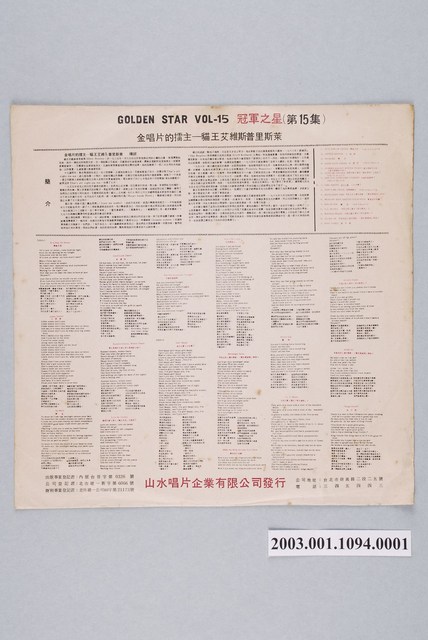 2003.001.1094.0001 山水唱片企業有限公司發行編號「SB-315」英語歌曲專輯《冠軍之星第15集:貓王普里斯萊歷年金唱片歌選》唱片封套