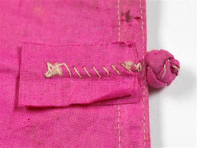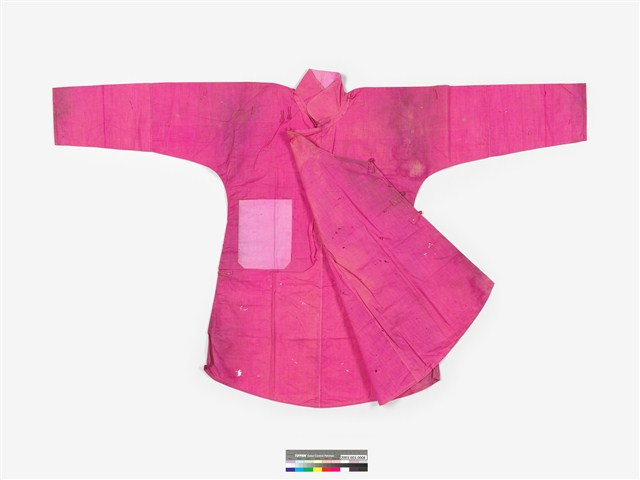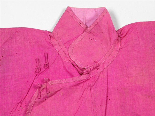 此為桃紅絲質立領長袖大襟衫,衣身修長、袖管細窄,合身細長的外型輪廓是1910~20年代漢族女衫的典型,製作時間約是1920~30年代。此件服裝保留了傳統大襟衫的鑲緄裝飾特點,立領、領緣、大襟、脇邊、開衩、下襬和袖口,都以相同的布料細細地鑲緄緣邊,領緣和立領部分都鑲緄斜條,六對直布扣亦是使用相同的材質製作,整件服裝雖然素色無紋但亮眼而喜氣,在古老年代許多不甚富裕的家庭婦女,在結婚都會製作紅色系服裝作為婚服,不但喜氣且在日後遇到喜慶宴會時亦可以拿出來穿著。此文物來自臺中清水楊肇嘉家族。