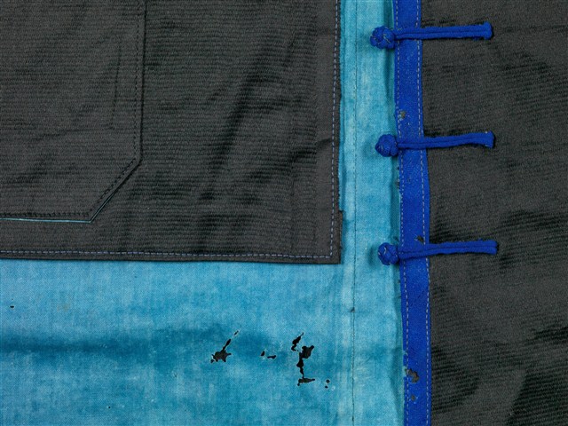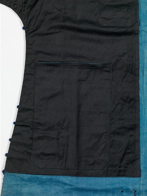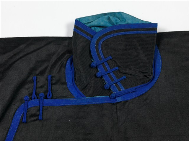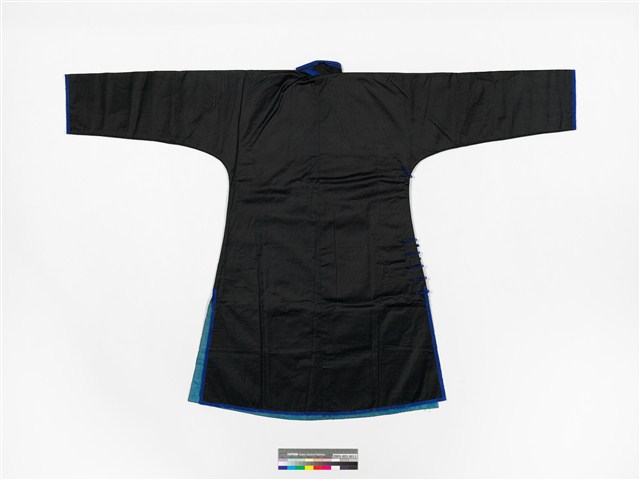 此為黑色絲光棉質立領長袖大襟衫,雙層布料製作,內裡是淺藍色棉布,衣身修長、袖管細窄,合身細長的外型輪廓是1910~20年代漢族女衫的典型,製作時間約是1920~30年代。此件服裝保留了傳統大襟衫的鑲緄裝飾特點,立領、領緣、大襟、脇邊、開衩、下襬和袖口,都以寶藍色布料鑲緄妝點,直布扣十二對布結紐頭的細小釦子,亦是使用鑲緄緣邊的相同材質製作,使整件服裝更具對點睛效果的搭配特質。領子配布鑲緄的外緣加飾一道細窄的牙子,加上高立領的款式,更是20世紀1920~30漢族女大襟衫上常見的裝飾特點。此文物來自臺中清水楊肇嘉家族。