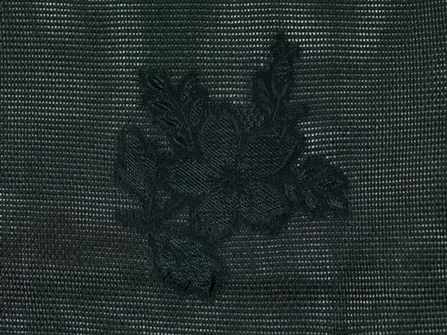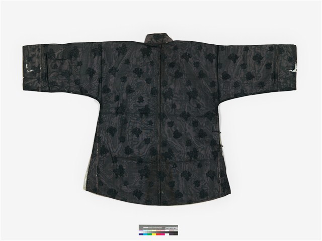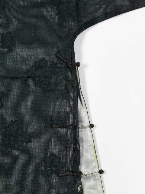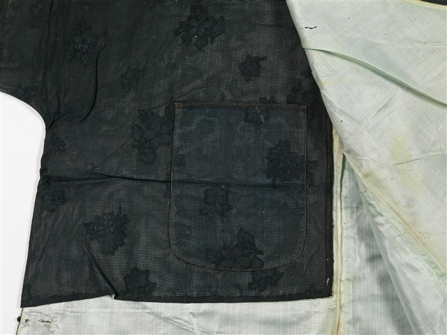 1. 此為灰色絲質緹花立領長袖大襟衫,內裡以淺灰色絲質布料製作,袖管細窄約五分袖,合身細長的外型輪廓脫離了清末民初的寬闊外型,是20世紀後漢族女衫款式。此件服裝保留了傳統大襟衫的鑲緄裝飾特點,立領、領緣、大襟、脇邊、下襬和袖口,都以黑色布料鑲緄妝點,在二十世紀初期婦女上衣已少有刺繡裝飾,鑲緄緣邊亦大量簡化,年輕婦女的衣扣出現盤扣和花扣等變化,年長婦女的服裝則趨近單純簡化,本件服裝頷下、大襟和脇邊有五對布結紐頭的細小釦子,使用鑲緄緣邊的相同材質製作,內斂而不張揚,從款式和和顏色判斷應屬於年長婦女的服裝。