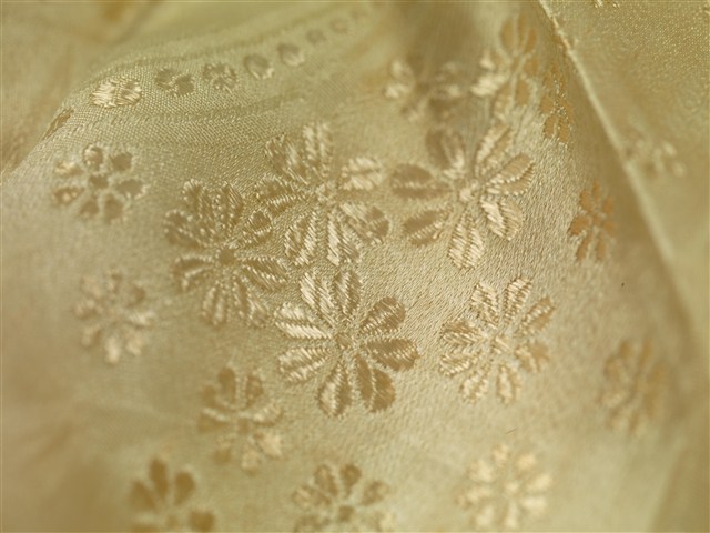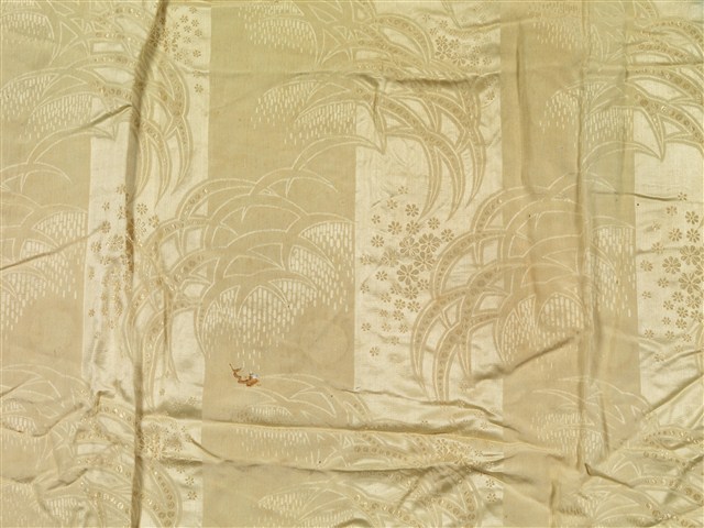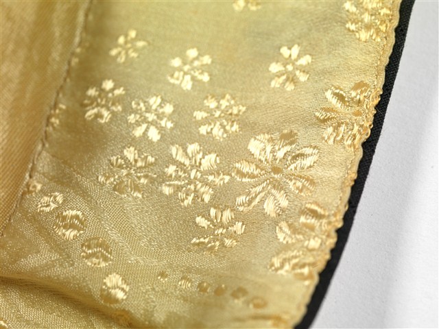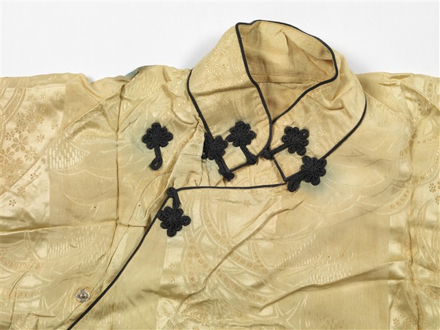 此為米白色緹花絲質立領長袖大襟衫,雙層布料製作,內裡是米白色棉布,一身表布暗紋緹花大唐草紋圖案相當顯眼,衣身修長、袖管細窄,合身細長的外型輪廓是20世紀初期漢族女衫的典型,製作時間約是1920~30年代。此件服裝保留了傳統大襟衫的鑲緄裝飾特點,立領、領緣、大襟、脇邊、下襬和袖口,都以黑色布料鑲緄妝點,服裝領子、頷下、大襟和脇邊有六對布結紐頭的花朵盤扣,亦是使用鑲緄緣邊的相同材質製作,但花扣造型使整件服裝更具有點睛效果的搭配特質。衣身前後中心為有剪接線,因此右身內襟就形成接襟剪裁,接襟處有暗釦綴縫,彰顯服裝完成的年代應是20世紀1920~30左右時間。此文物來自臺中清水楊肇嘉家族。