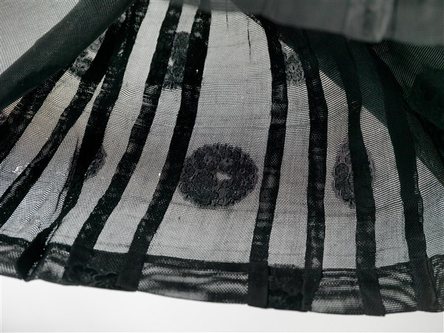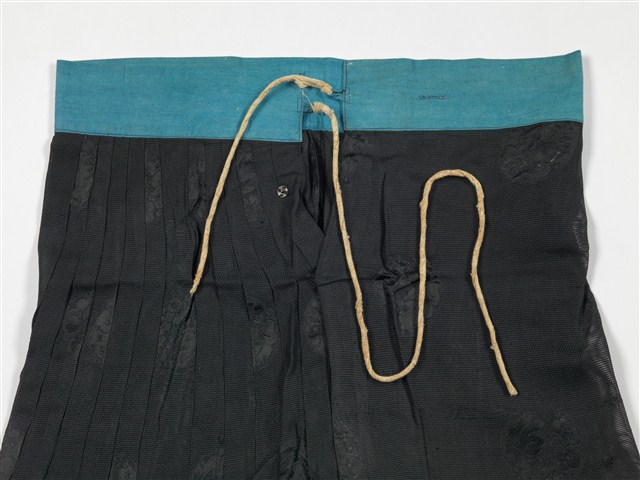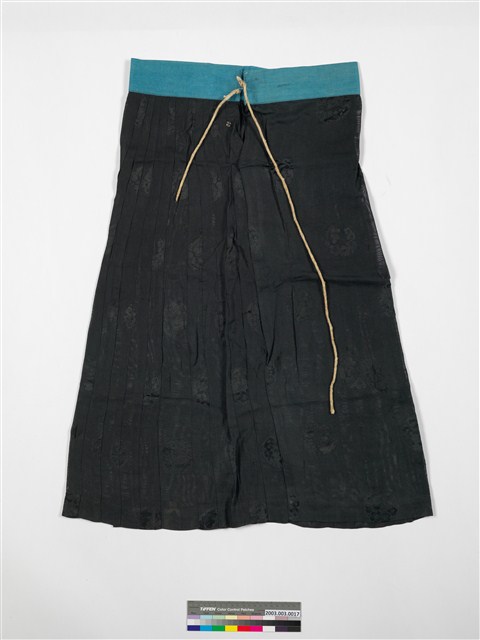 1. 黑網紗梅花暗紋百褶筒裙,裙腰使用青色棉布,並縫有米色棉質繫繩與金屬暗扣,裙擺部分為雙層,內裡黑棉布,外層為黑色網紗,網紗上有梅花暗紋,紋樣形式為一片葉子與五朵由大至小排列的梅花組成圓形圖案,平均分布於裙襬上。2. 臺灣日治中期以後受到西化影響,裙子的紋樣與結構均有簡化,此種百褶筒裙裙內無需再穿著褲子。