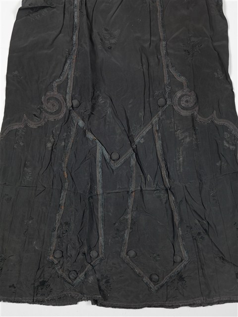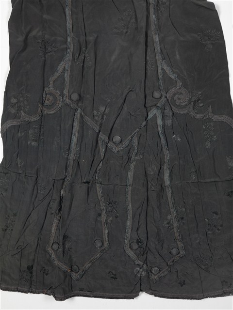 1. 黑稠緹花包釦綴飾百褶裙。裙頭以白色棉部製成,左右兩側附有綁帶,可見泛黃的汙漬痕跡。前後二片裙幅以黑色花卉暗紋緹花軟綢裁製而成,前後面縫於裙頭上,左右留有開口,臀部以下的裙幅相接,裙幅表面以黑色織帶勾勒出劍帶紋及流雲紋樣,並飾以黑色包釦,下擺打摺,下緣以黑色織帶緄邊。穿著時由下而上套起,再以腰帶纏繞於腰際。根據館方來源資料,本件來自臺中清水楊肇嘉家族。2. 臺灣早期婦女穿著的裙子形制以馬面裙為主,因穿著上不方便,日治時期時受到西化影響,逐漸改良成西式的裙形,裝飾上也出現包釦、荷葉邊等西式風格,本件為傳統百褶裙過渡至西式筒裙之改良式裙代表。