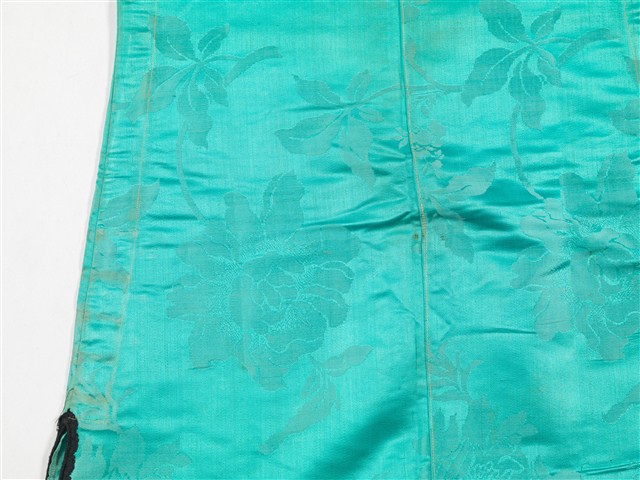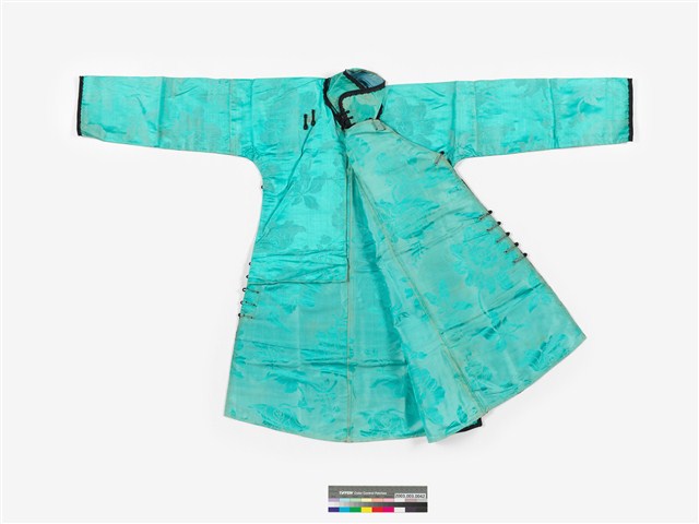 此為淺藍色緹花絲質立領長袖大襟衫,衣身修長、袖管細窄,合身細長的外型輪廓是1910~20年代漢族女衫的典型,高立領屬於30年代女裝的流行要素,所以此件服裝製作的時間約是1920~30年代。此件服裝保留了傳統大襟衫的鑲緄裝飾特點,立領、領緣、大襟、脇邊、下襬、開衩、和袖口,都以黑色布料鑲緄妝點鑲緄,外緣更加綴細窄的蕾絲花邊,扣合的布扣亦是使用鑲緄緣邊的相同材質製作,領、襟和脇邊處共有十二對布扣,盤扣是以黑色斜布製作,高高的立領上有四對扣子,脇邊亦有六對布扣,黑色的質布扣在淺藍色布料上非常的突出有特色。大襟衫上以配布鑲緄的外緣加飾細窄的蕾絲花邊,典雅的色彩搭配和細緻的鑲緄和舶來品的花邊,顯現出清麗優雅的風姿,此應為富有家庭年輕婦女的禮服。此文物來自臺中清水楊肇嘉家族。