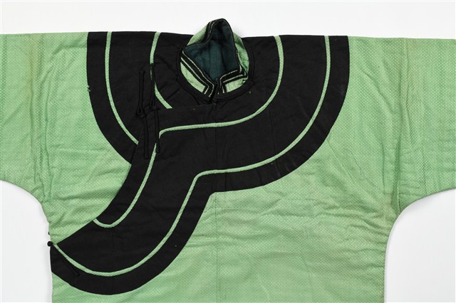 此為淺綠色絲質立領長袖大襟衫,衣身修長、袖管細窄,合身細長的外型輪廓是1900~20年代漢族女衫的典型,高立領屬於30年代女裝的流行要素,所以此件服裝製作的時間約是1900~20年代。此件服裝保留了傳統大襟衫的鑲緄裝飾特點,立領、領緣、大襟和袖口,都以黑色布料鑲緄,外緣更加綴大小層次不同的貼布,扣合的布扣亦是使用鑲緄緣邊的相同材質製作,領、襟和脇邊處共有八對布扣,長而直的布扣,細窄而秀氣,黑色的鑲緄配布和直布扣在淺綠色布料上非常的突出有特色。十九世紀末期的婦女大襟衫,領、袖、大襟經常有寬闊的鑲緄和刺繡’裝飾,二十世紀初期鑲緄配布逐漸變得細窄或條狀芽邊,此件服裝襟頭上仍留有弧度的鑲緄配飾,典雅的色彩搭配和寬闊的鑲緄配飾,顯現出清麗優雅的風姿,此應為是十世紀初期富有家庭年輕婦女的禮服。此文物來自臺中清水楊肇嘉家族。