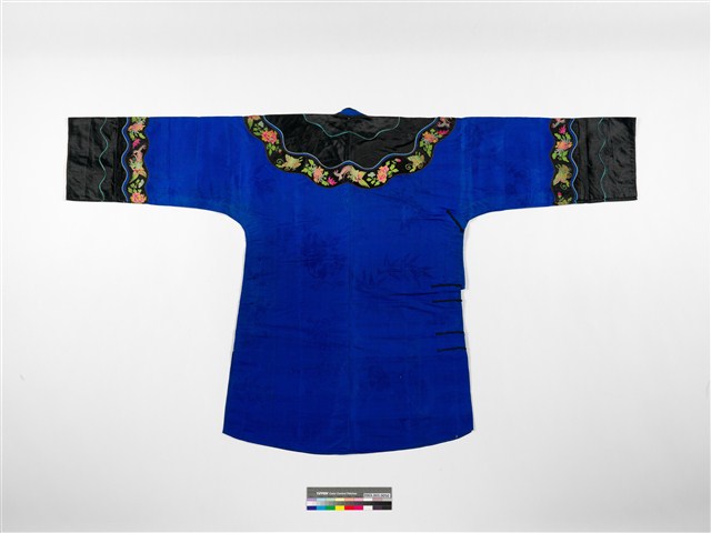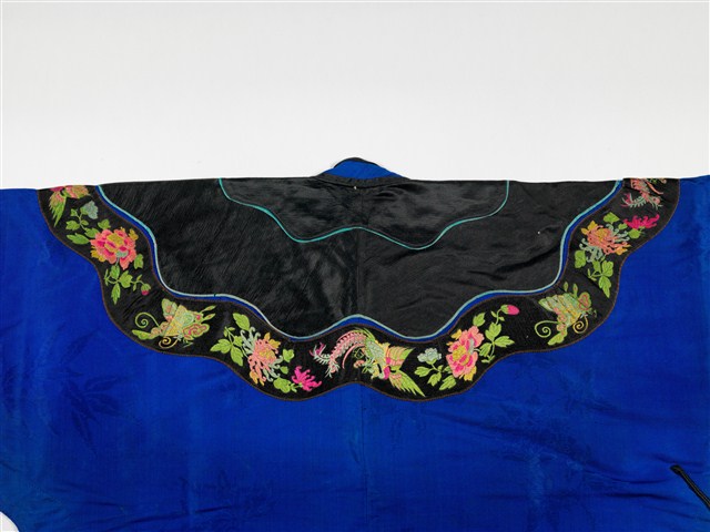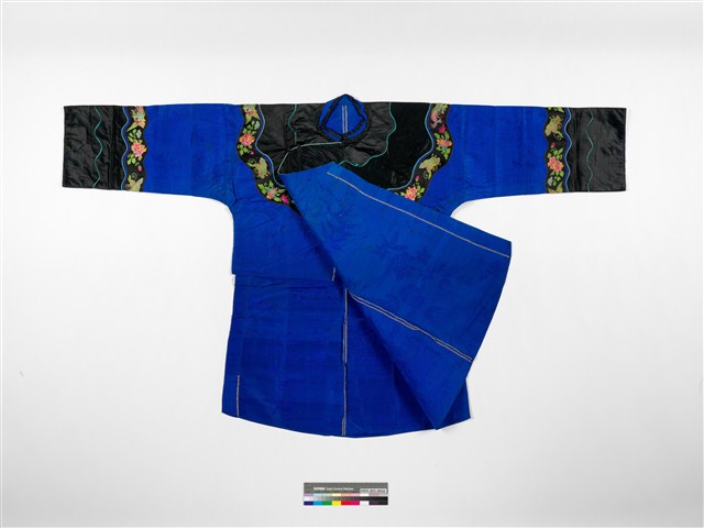 1. 此大襟衫為單層布料製作,表布為寶藍色絲質緹花材質,大襟、袖口都搭配黑色布料做鑲緄緣邊,領子及大襟、袖口鑲緄布料做成二段式波浪狀裁剪,外緣再配飾細小水藍棉布牙子以及花葉瑰麗的多色緹花織帶,瘦長的窄袖和芽邊裝飾,俐落的形貌上有莊重富麗的華美。2. 此大襟衫領型為小立領,雖然領圍很小,但領子最外緣以黑色布料鑲緄,最原在做出芽,與衣身相呼應,做工細膩繁複。大襟末端鑲緄貼布做花朵變化的紋飾,形成整件服裝裝飾的重點,外緣貼飾細小的牙子和多色緹花織帶,依照鑲緄輪廓轉折呈起伏的波浪,強化了大襟鑲緄外形,相當精緻而美觀。細長的直布扣用布和大襟、袖口配飾相呼應,以布結紐頭的型態,單純而優美,此大襟衫應是年輕婦女的禮服。