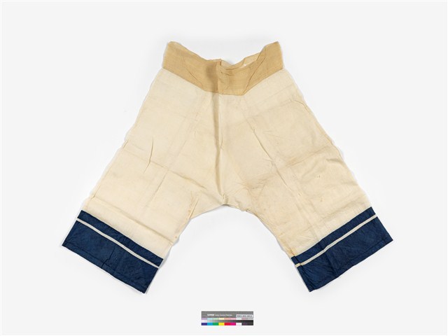 1. 白麻地藍條紋飾邊合襠褲,褲管以白色麻布裁製成,直筒狀,褲腳緄一粗一細深藍色染布邊,腰頭布為白色麻布,略泛黃,褲襠縫合。根據館方來源資料,本件來自臺中清水楊肇嘉家族。2. 早期的褲子形式只有兩條褲管,套在小腿上,稱「脛衣」,後來褲管延伸到大腿,並加上褲襠部分。褲襠若縫合稱「合襠褲」,可直接外穿,臺灣早期漢人的傳統褲子,由於褲襠寬大,又稱「大襠褲」。