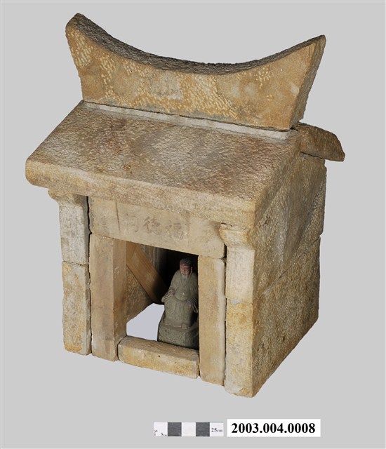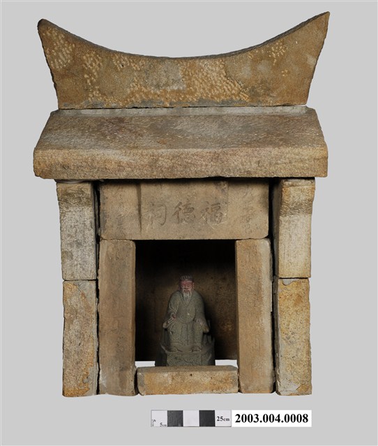 本文物一組共兩件,包括石造福德祠,以及石雕福德正神像。福德祠為廟名,一般稱福德正神為土地公,供奉福德正神的廟為土地公廟。本福德祠全由石板建造而成,屋脊做燕尾,屋頂為兩片石板,三面壁,正立面由兩側門柱、門楣、門檻組成,屋簷下做出疊澀線條。本廟門楣中央作出廟名匾的線腳,刻題廟名福德祠。石板間後修理時再加上水泥補強。門柱上有對聯,頭為福、正,尾為德、神,合為福德正神,中間其他字跡已模糊。背立面內側,即神位壁面,刻「福德正神香位」文字。福德正神為神格低的基層神明,管理小範圍土地內的事務,由管理事務的不同,可分為田頭田尾土地公、庄頭庄尾(街頭街尾)土地公、把水土地公、守墓后土等。本件福德祠屬日本時代以後較為盛行的土地公廟型態,清代多為更簡單的石棚或僅有石頭像的型態。