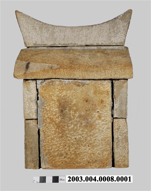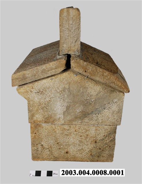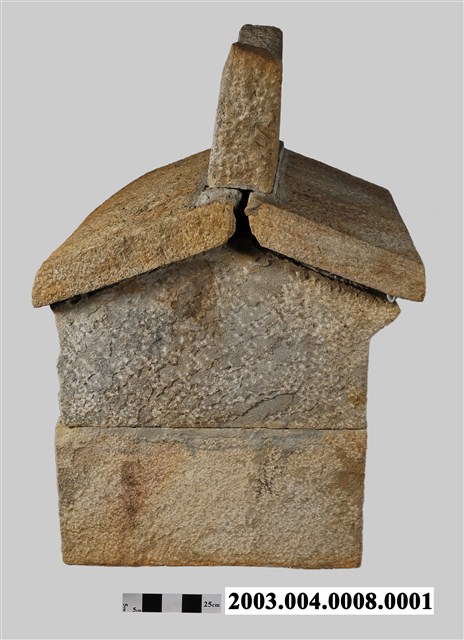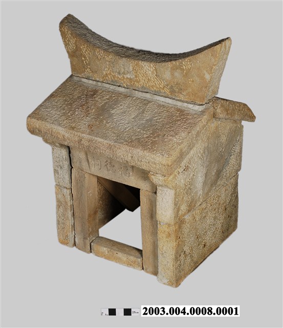本文物一組共兩件,包括石造福德祠,以及福德正神石神像。本件為石造福德祠。福德祠為廟名,一般稱福德正神為土地公,供奉福德正神的廟為土地公廟。本福德祠全由石板建造而成,屋脊做燕尾,屋頂為兩片石板,三面壁,正立面由兩側門柱、門楣、門檻組成,屋簷下做出疊澀線條。本廟門楣中央作出廟名匾的線腳,刻題廟名福德祠。背立面內側,即神位壁面,刻「福德正神香位」文字。石板間後修理時再加上水泥補強。門柱上有對聯,頭為福、正,尾為德、神,合為福德正神,中間其他字跡已模糊。本件福德祠屬日本時代以後較為盛行的土地公廟型態,清代多為更簡單的石棚或僅有石頭像的型態。根據購藏來源資料,本文物來自苗栗。