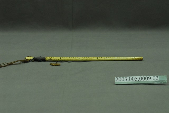 1.本物件是厘秤秤桿,包含秤頭、秤桿。秤頭上鑲有1圈鐵片並有細繩可固定懸掛式秤盤,2側各有1個流蘇狀的繩編提耳,前者秤較重的,後者秤較輕的;秤桿為木製黃色圓形長桿,上面刻有黑色刻度。
