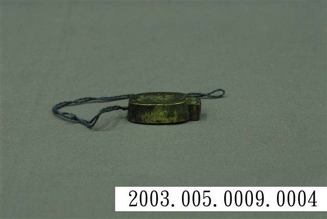 1.本物件為銅製秤錘,外觀呈立體水瓶造型,佈滿銅綠。秤錘表面有6個圓形凹洞,錘頂上方圓孔綁有1條藍色繩子。