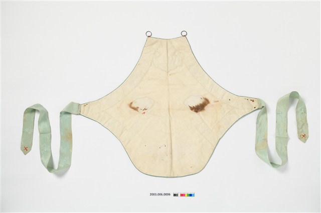 1. 此件為菱形下端略寬形肚兜,正面為米色綢緞,反面為米色棉布,背面可看出將數塊布料縫於底布的痕跡,並且有多處污損,顯示使用過的痕跡,其中在正面圍腹上方兩處污損與背面污損處相同,此外,腰側有淺綠綁帶用以繫在腰上。刺繡技法主要以直針做變化,正面紋飾方面,四面以綠色線結邊做紋樣分隔的邊框,圍頸部分做如意雲紋邊框,裡面繡有枴子龍飾邊、鶴紋,上方縫有兩個金屬環用以繫繩。肚兜兩邊對稱的繡有枴子龍方框,內裡繡有蝙蝠、盤長;圍腹部分為主要紋飾,上方繡有蝙蝠,中間繡有雙鹿相對,雙鹿中間繡有銅錢紋,周邊繡有數桿修竹、松樹;圍腹上方兩側的小菱形則各繡有一隻雞公,倆倆相對。竹鹿與台語的「得祿」諧音,松樹象徵長壽,蝙蝠的蝠與福諧音,雞公的雞與吉諧音,故此件肚兜象徵福祿壽俱全的美好寓意。2. 肚兜隨時代變遷形制、名稱均有改變,至清代開始稱作肚兜,臺灣也承襲此一名稱,別名還有抹胸、裹肚、兜兜等,但是臺灣肚兜通常先將紋樣繡於布片,再縫於肚兜上,裝飾安排上,紋樣多集中在下方口袋與緄邊,此兩點與中國地區肚兜有很大差別。另外,早期肚兜男女老幼都會使用,在口袋部分有時會放置香料或藥材,可見肚兜還有香囊以及藥療的功能。