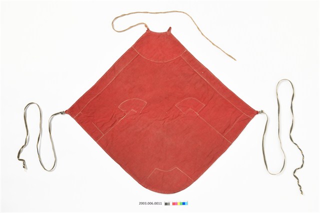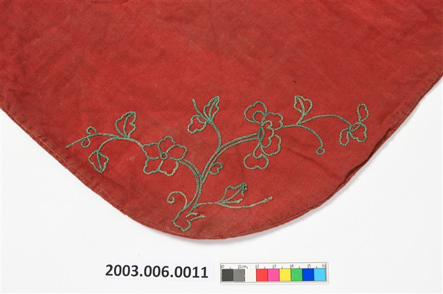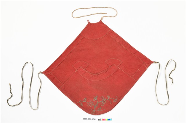 1. 此件肚兜為菱形,正反兩面均為紅色底布,有些微污損,此外,在圍頸上方、腰部兩側均縫有棉繩做綁帶。除了圍腹部分以辮繡繡有象徵富貴的牡丹紋,沒有任何紋飾,僅以黃線簡單在布片周圍結邊,再縫於肚兜底布上,圍腹口袋上方兩側同樣各有一個小菱形。本件肚兜無論是下端為略窄的圓弧,或紋樣的佈排,均是臺灣常見的肚兜樣式。2. 肚兜隨時代變遷形制、名稱均有改變,至清代開始稱作肚兜,臺灣也承襲此一名稱,別名還有抹胸、裹肚、兜兜等,但是臺灣肚兜通常先將紋樣繡於布片,再縫於肚兜上,裝飾安排上,紋樣多集中在下方口袋與緄邊,此兩點與中國地區肚兜有很大差別。另外,早期肚兜男女老幼都會使用,在口袋部分有時會放置香料或藥材,可見肚兜還有香囊以及藥療的功能。