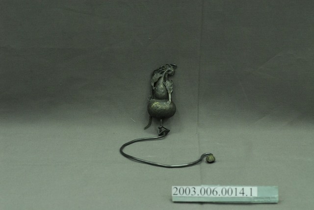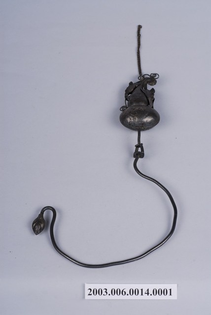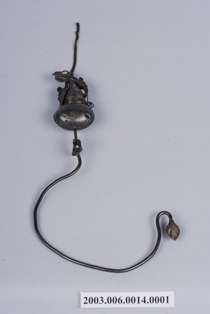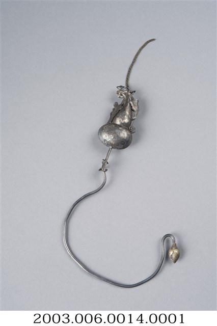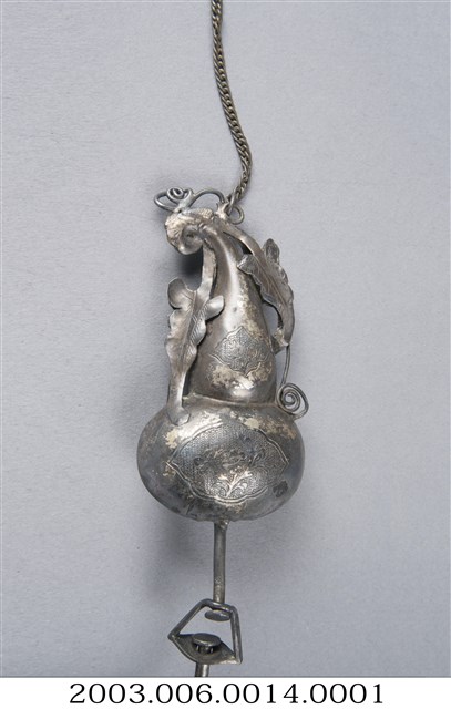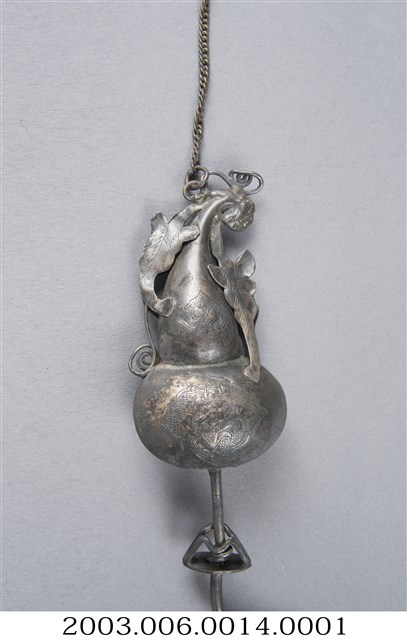 銀製葫蘆鉤,帳鉤,長12cm、寬22.2cm、高2.2cm,依部分可分為葫蘆形的鉤頭與半圈形的鉤圈,在鉤頭部分,上端連有兩個葉子形飾片及一條固定用之鏈子,葫蘆的上下腹部皆有淺浮雕,唯因表面氧化而使圖樣不甚清晰。下方環形鉤圈通體不裝飾,但在尾端做花苞狀膨起,整體為葫蘆連結藤蔓之造型,葫蘆音近富仔,蔓音同萬,而被賦予富貴萬代的寓意。另外葫蘆多籽,又有子孫萬代的吉祥意味。