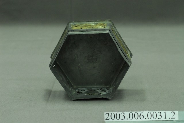 本文物為六角鏤空粉盒身,以鏤空雕花以貼金設計 ,已有部分的貼金剝落。女性臉上的妝扮為其對特定生活之想像,相對地女性之美也時常受限於社會傳統價值觀,妝扮女性的化妝品及其附屬產品,則體現了社會審美觀和科技的變動。
