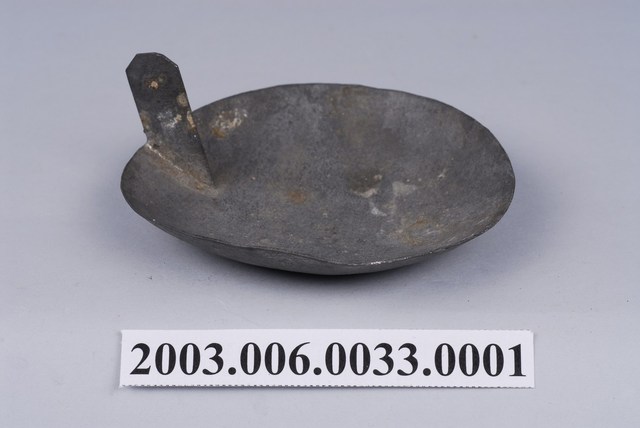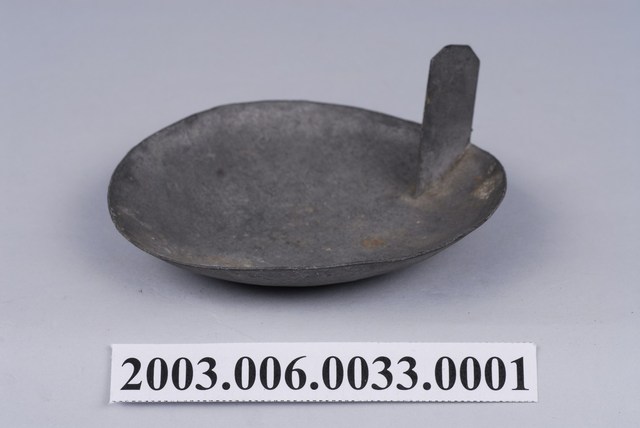 1.本件錫製油燈碟為部件之1,與壁掛式立柱油燈成關係組件,2件皆可獨立作油燈使用。油燈碟外型為上寬下窄,平口外侈,淺腹平底之碟形器。於器內一側帶有直立式錫片,如需移動時,可用拇指與食指夾提即可。本件油燈碟為日常平民使用之實用器,直接於碟內添加燈油後,放置燈芯點燃即可作照明使用。2.臺灣在電燈尚未普及的時代,係以蠟燭、電石、植物油與煤油等燃料作夜間照明使用。油燈碟造型簡單樸素,多為日常平民之實用器,其材質以陶瓷與金屬居多。