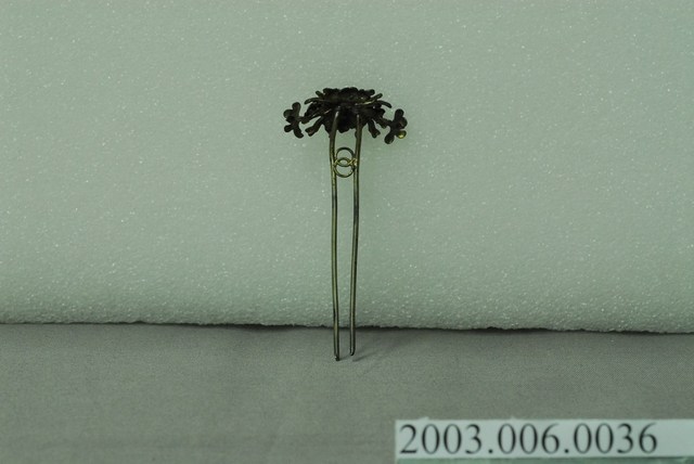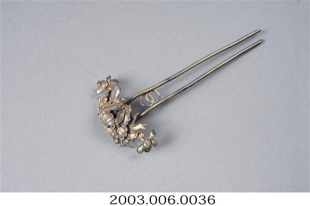 此釵以銀為主要材質,並加以鎏金而成。先將細銀片打製成形,再以細銀絲鑲成立體線條,最後把銀片貼合成立體花卉作爲釵頭。釵面花朵盛開,花瓣細長捲曲,左右對稱伸展呈彎月狀。釵頭背面焊以彎曲銀條成雙股釵身,釵身近釵頭處以雙環相交,焊接處用金屬線捲曲纏繞成螺旋狀。整體造型簡單雅潔,曲線優雅。此種花卉造型的頭飾,為清代臺灣民間常見的女子飾品樣式之一。