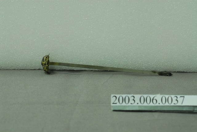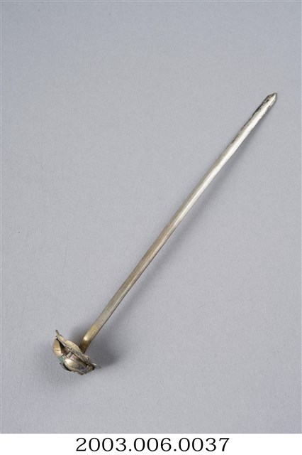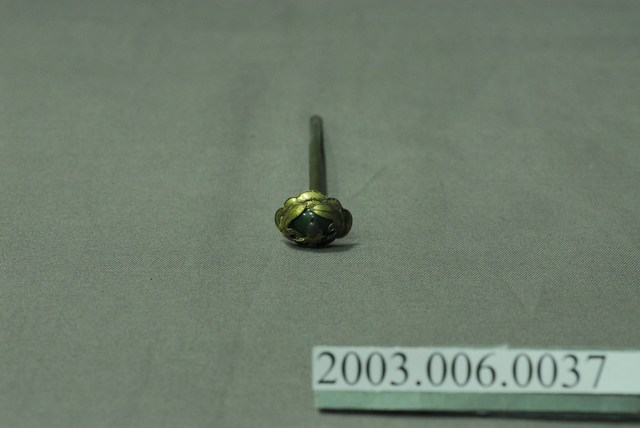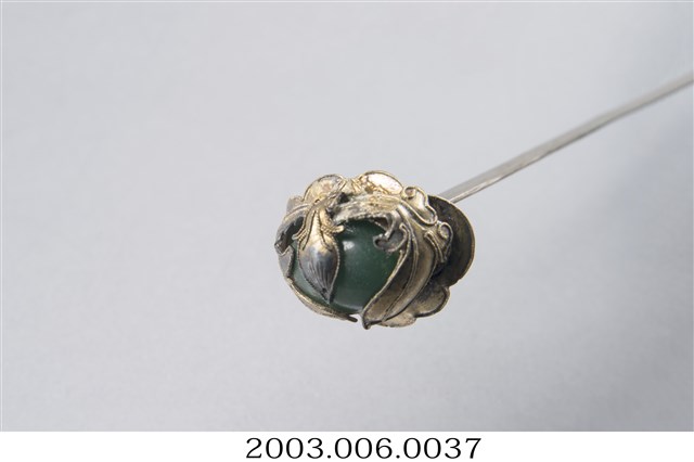 此釵以銀為主要材質,並加以鎏金而成。先將薄銀板打製成雲頭形,中間鑲嵌青綠色玉石,上貼以銀絲細工鑲邊之銀片,呈現出花心鑲嵌翡翠綠玉,兩旁捲葉包覆之的花卉造型簪首。花草線條是以多股細銀絲扭轉纏繞而成,繩紋造型甚具裝飾效果,增添不少立體感。此件因年代久遠,簪首處有部分磨損,表層鎏金面多處脫落,露出下方銀底,簪尾處呈現化學反應發黑現象。此種花草鑲嵌玉石的頭飾形制,為清代臺灣民間常見的女子飾品樣式之一。