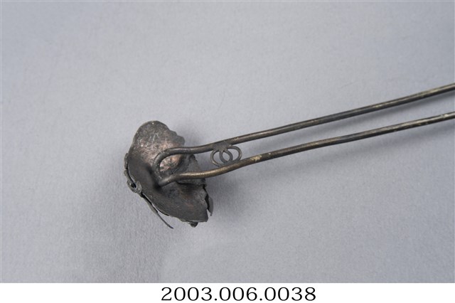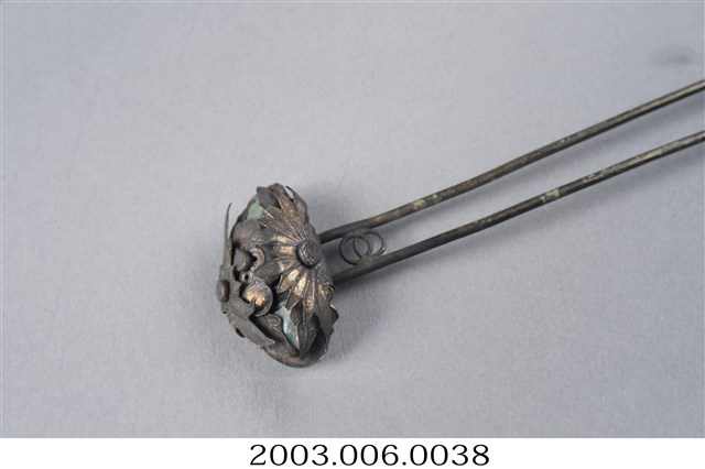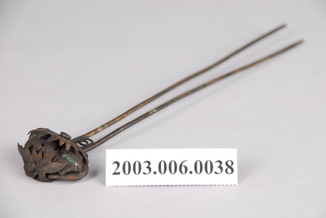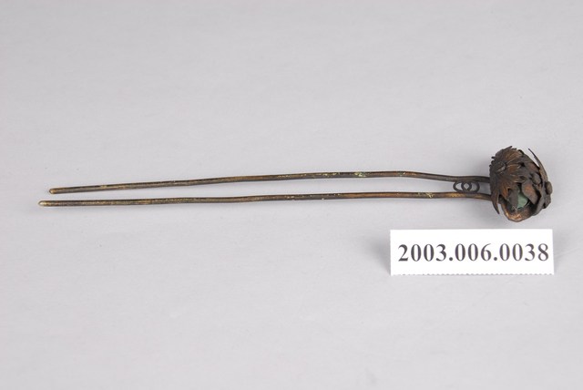 此釵以銅為主要材質,並加以鎏金而成。先將薄銅板打製成形,以青綠色玉石鑲嵌其中,上貼數朵菊花造型銅片,將中央玉石層層包裹作為釵頭。釵頭背面焊以彎曲銅條成雙股釵身,釵身近釵頭處有雙環相交。此件因年代久遠,表面鎏金層經長期磨損,露出下方銅胎原色,某些脫落處生有銅綠鏽蝕。「菊」與「吉」發音接近,又有花中君子的美稱,深具吉祥寓意,是常見的女子頭飾圖樣。