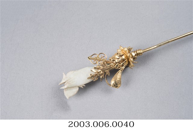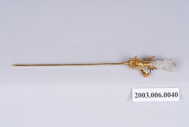 此簪通體修長,簪首處依材質分為上下兩部分。上方為佛手拈花造型玉石,下方為金屬寶蓮花座,中間鑲柄處自左而右為拂塵、火焰以及錫杖。佛手諧音「福壽」,具有福壽雙全的吉祥寓意;佛家形制的髮簪,也象徵著佩戴者具有佛家的從容與安詳。此簪通常作為中老年婦女的髮飾,是清代臺灣民間流行樣式之一。