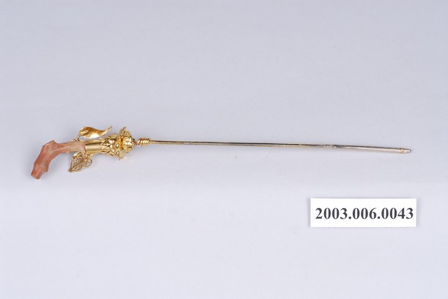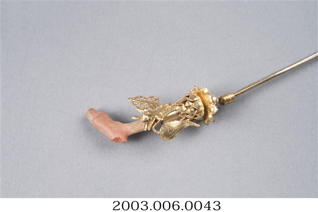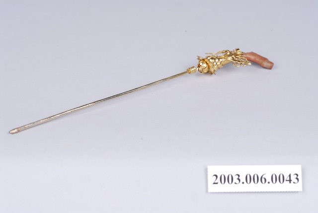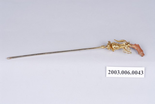 此簪依結構分為簪首與簪身兩部分。簪首處中央呈中空管狀,上嵌自然向上彎折的紅珊瑚,中間以拂塵、火焰以及錫杖為飾,下裹層層蓮瓣製成蓮花底座。座下以細銀線纏繞而成的彈簧與簪身相互連結,使其插戴於髮間時隨步顫動搖晃。此種頂端另鑲其他材質的蓮座簪,流行於清代臺灣民間,不過多半以玉石為飾,以珊瑚作為簪頭較為少見。