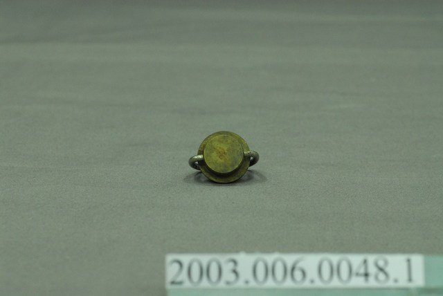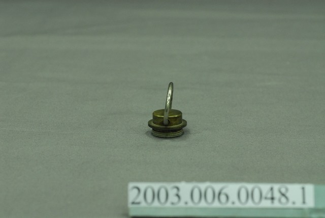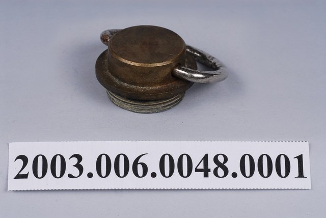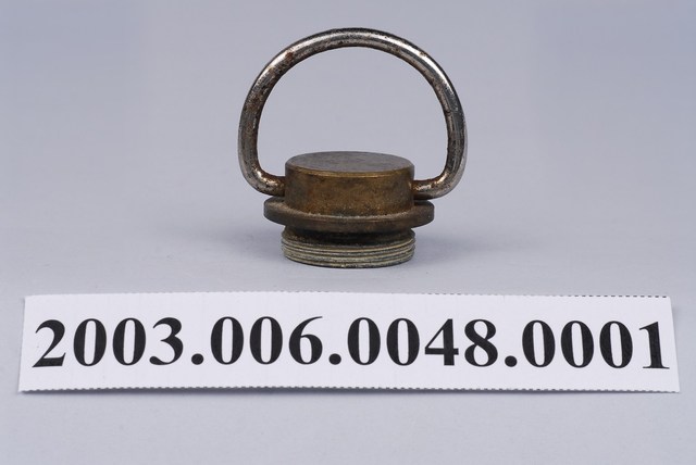 1.此為鍍鋅製水龜之器蓋,長約3.5公分,寬約3.5公分,高約1.3公分。此器蓋為黃銅製,外觀呈圓柱型,上半部附半環紐及旋柱,下半部有鑿螺紋可與器身立唇密合栓住。雖有部分銹蝕,仍可旋入器身之中。2.水龜多為鋁製或陶製扁平橢圓器具,表面有水平壓紋設計,形似龜殼故得此名,做為保暖或保冷用途。使用時旋開器蓋,注入燒開熱水後鎖緊,裹以棉布避免觸碰燙傷,就寢前放置於被襖中,做為暖床之效。翌日晨間可利用壺內水之餘溫盥洗,是冬日保暖的重要器具。水龜另可倒入涼水或碎冰做為冰枕,可消退感冒發燒症狀,達到降溫效果。