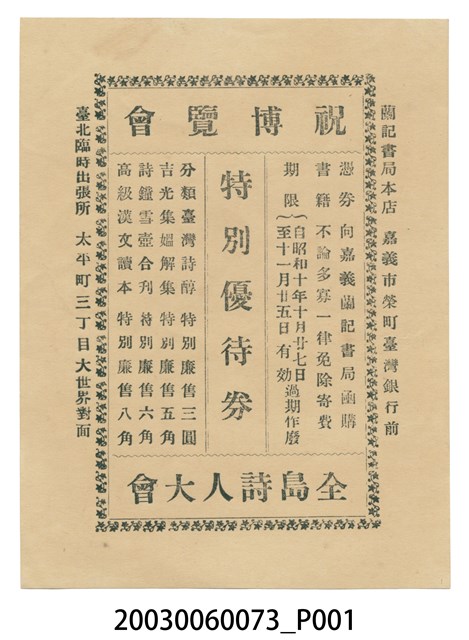 本物件為始政四十周年慶祝博覽會全島詩人大會特別優待券,憑券可向嘉義蘭記書局函購書籍,無論多寡免運費,有效期限自昭和10年10月17日至11月25日。右方寫有「蘭記書局本店 嘉義市榮町臺灣銀行前」,左方寫有「臺北臨時出張所 太平町三丁目大世界對面」。