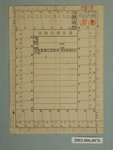 本物件為通信院貯金保險局的15年期養老保險證書50120號,保額為「百七拾四元」,保費為「壹圓」,要保人為「洪敬」,被保險人為昭和7年(1932)11月1日出生的「洪惠雄」,保險受益人為「洪敬」;保險證背面則記載繳交各期保費時間、金額、收款單位等資料。