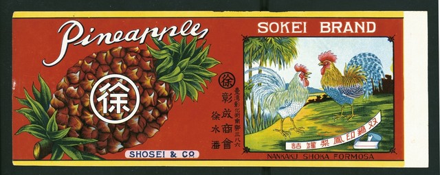 1.本物件為彰成商會鳳梨罐頭商標紙,紅底黃邊,左方為一鳳梨圖樣並印有「徐」字樣,其上寫有「Pineapple」字樣;右為其雙雞印鳳梨罐頭商標,背景為兩隻公雞的圖示,其上為「SOKEI BRAND」字樣;中央標明「彰成商會」以及其地址「臺灣彰化街南郭三八六」,「Nankaku shoka」即為南郭與彰化。在彰成商會旁寫有徐水潘一名,或許為商會重要成員。下方「NET WEIGHT 500 GRM」標明其淨重500公克。