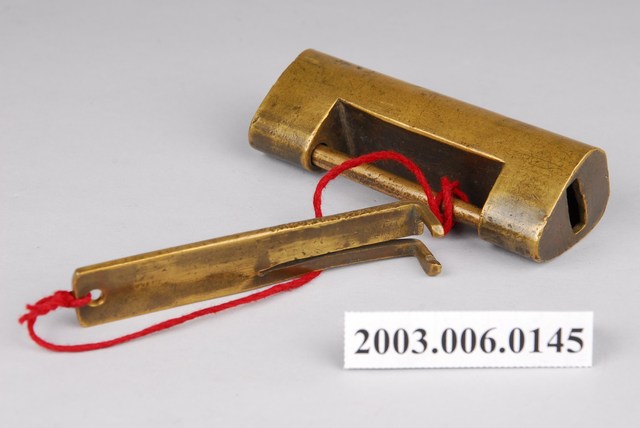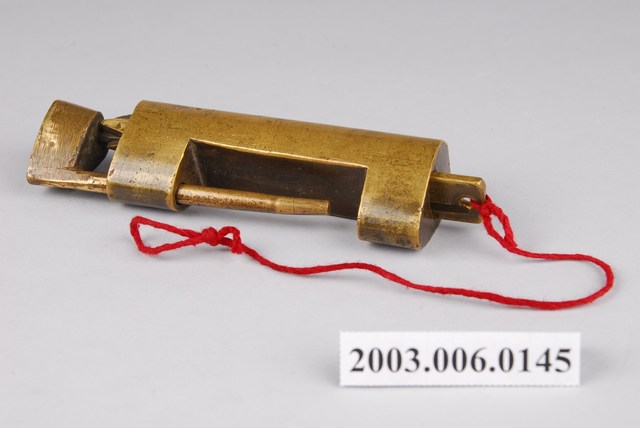 1.紅銅製橫式鎖具,又稱「廣鎖」,鎖頭上部呈三角形,下部呈正方形。本件為需要鑰匙開啟的簧片構造鎖,鑰匙孔開在側面,形狀為文字形「一字」,本件鑰匙用紅繩綁在鎖樑上。2.金屬鎖的大量使用始於東漢,分為簧片構造鎖與文字組合鎖兩大類,常用於鎖門、鎖櫃、鎖箱、…等。簧片構造鎖構造分為鎖樑、鎖栓、彈簧片、鎖梗、鎖體、鑰匙。文字形鑰匙孔,其文字的選擇有使用身分限制,其複雜度是按官職遞增,本件「一」字為庶民百姓所使用的鎖具,亦有用於祈求健康或婚嫁而使用的文字。