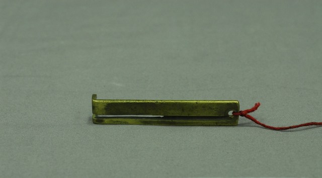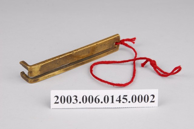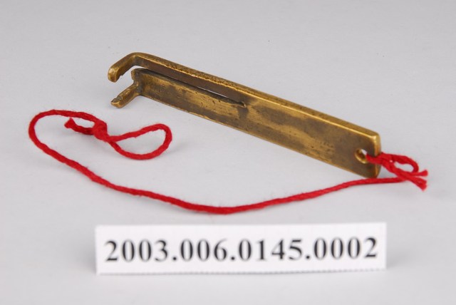 1.本件為紅銅製橫式鎖具之鑰匙,扁平狀,前端成九十度分岔勾起。2.金屬鎖的大量使用始於東漢,分為簧片構造鎖與文字組合鎖兩大類,常用於鎖門、鎖櫃、鎖箱、…等。簧片構造鎖構造分為鎖樑、鎖栓、彈簧片、鎖梗、鎖體、鑰匙。文字形鑰匙孔,其文字的選擇有使用身分限制,其複雜度是按官職遞增,本件鑰匙用於「一」字孔,為庶民百姓所使用的鎖具,亦有用於祈求健康或婚嫁而使用的文字。