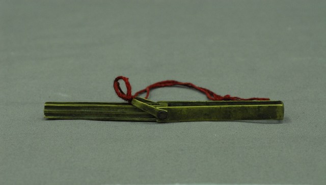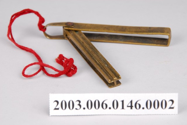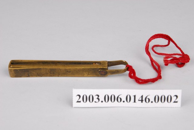 1.本件為紅銅製橫式鎖具之鑰匙,字形「ㄓ字」,可摺疊收於紅銅製鑰匙套中。2.金屬鎖的大量使用始於東漢,分為簧片構造鎖與文字組合鎖兩大類,常用於鎖門、鎖櫃、鎖箱、…等。簧片構造鎖構造分為鎖樑、鎖栓、彈簧片、鎖梗、鎖體、鑰匙。文字形鑰匙孔,其文字的選擇有使用身分限制,其複雜度是按官職遞增,亦有用於祈求健康或婚嫁而使用的文字。