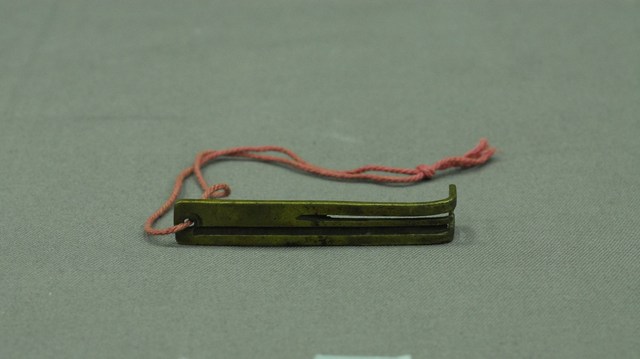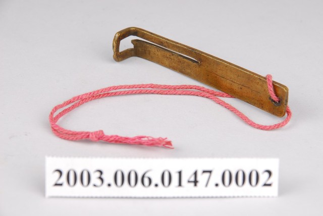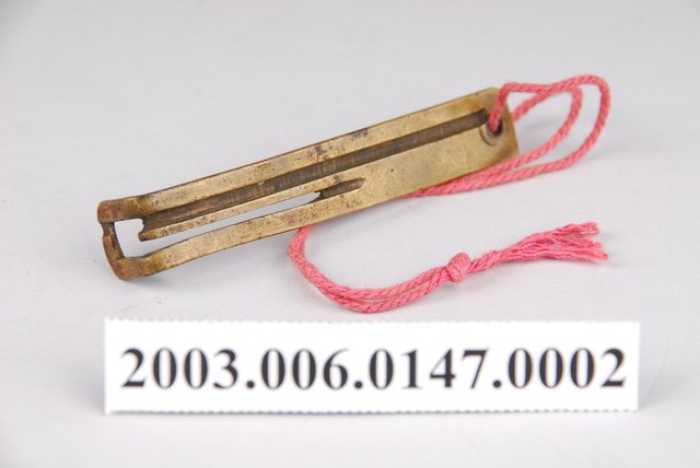 1.本件為紅銅製橫式鎖具之鑰匙,扁平狀,前端成九十度分岔勾起。2.金屬鎖的大量使用始於東漢,分為簧片構造鎖與文字組合鎖兩大類,常用於鎖門、鎖櫃、鎖箱、…等。簧片構造鎖構造分為鎖樑、鎖栓、彈簧片、鎖梗、鎖體、鑰匙。文字形鑰匙孔,其文字的選擇有使用身分限制,其複雜度是按官職遞增,本件鑰匙用於「一」字孔,為庶民百姓所使用的鎖具,亦有用於祈求健康或婚嫁而使用的文字。