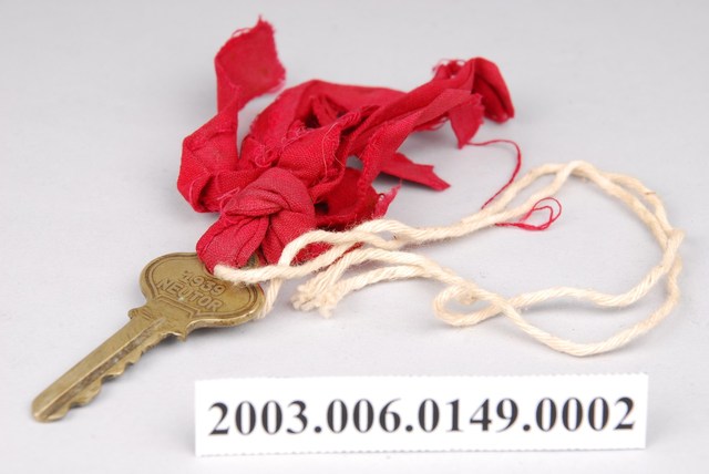 1.本件為TBC銅製古董鎖之鑰匙,屬於「彈子鎖」,原理是使用多個不同高度的圓柱形零件,鎖住鎖芯。當放入正確的鑰匙,各鎖簧被推至相同的高度,便能轉開鎖芯。鑰匙上刻有「1939NEUTOR」字樣。2.彈子鎖是老奈納斯‧耶魯(Linus Yale, Sr.)發明於1848年,之後他的兒子小奈納斯‧耶魯(Linus Yale, Jr)將其改良。