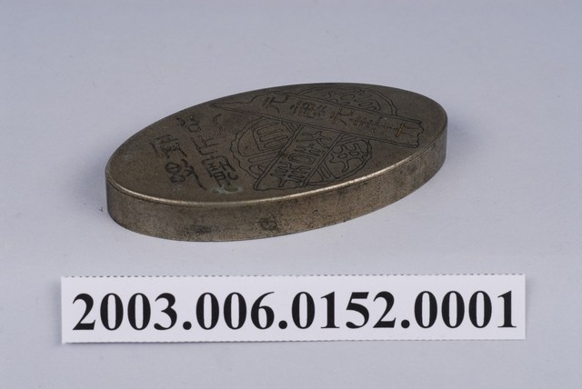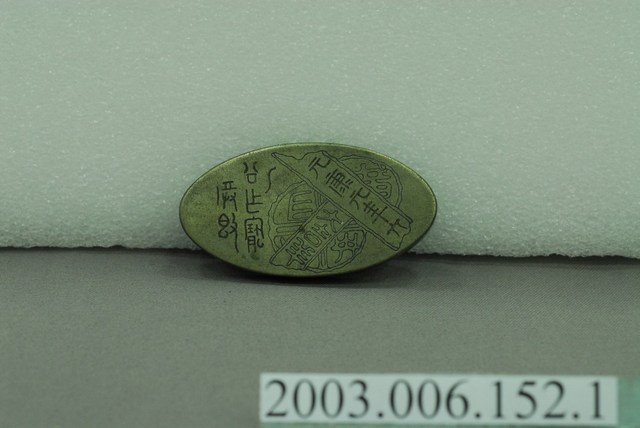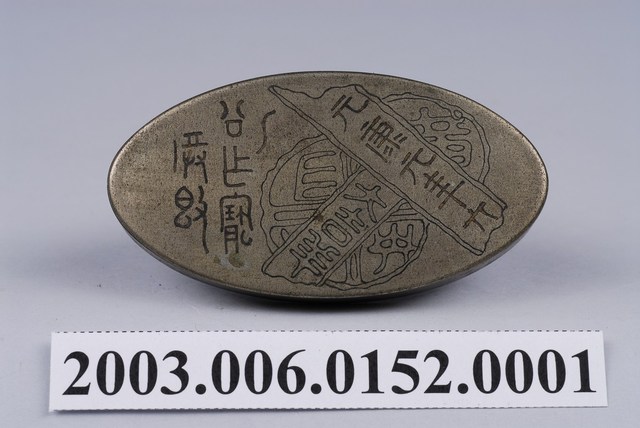 本物件為盛裝墨汁之銅製楕圓形墨盒,將墨汁盛裝後可方便攜帶使用,上蓋刻有圖樣圖像及「大吉羊」、「元康元年六」等字。
