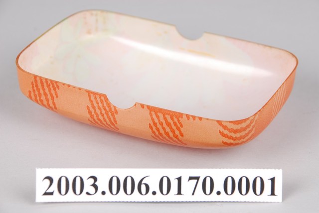 1.此為賽璐珞肥皂盒盒蓋,器長10.5公分,寬7公分,高2.7公分,整體器身呈長方盒狀,賽璐珞製成。底色為橘色格紋襯向日葵花,分盒蓋與盒底兩部分,器頂與底面皆為弧狀表面。盒蓋長邊側中段有一半圓上凹設計,方便拿取上蓋。盒底底面中央鑿有5個圓孔,四方角落有乳釘狀淺足,以利排水晾乾。盒底內側有部分侵蝕痕跡,整體而言保存完整。2.日治時期初期,肥皂使用率尚未普及,隨著總督府推行現代衛生政策,臺灣人清潔習慣逐漸改變,肥皂需求量提升,至1930年代後期,一般民眾多以肥皂洗滌衣物。使用肥皂盒盛裝肥皂,便於拿取和保存,延長肥皂使用時間。