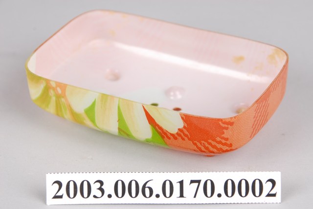 1.此為賽璐珞肥皂盒盒底,器長10.2公分,寬6.8公分,高3公分,整體器身呈長方盒狀,賽璐珞製成。底色為橘色格紋襯向日葵花,分盒蓋與盒底兩部分,器頂與底面皆為弧狀表面。盒底底面中央鑿有5個圓孔,四方角落有乳釘狀淺足,以利排水晾乾。盒底內側有部分侵蝕痕跡,整體而言保存完整。2.日治時期初期,肥皂使用率尚未普及,隨著總督府推行現代衛生政策,臺灣人清潔習慣逐漸改變,肥皂需求量提升,至1930年代後期,一般民眾多以肥皂洗滌衣物。使用肥皂盒盛裝肥皂,便於拿取和保存,延長肥皂使用時間。