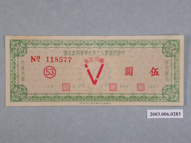 2003.006.0283 中華民國軍人之友社勞軍捐款伍圓收據