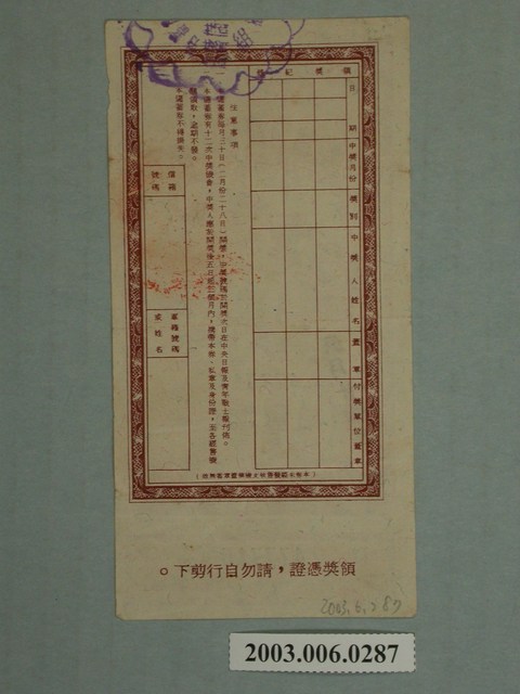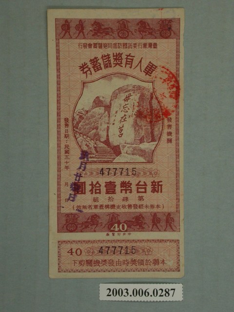 2003.006.0287 新台幣壹拾圓軍人有獎儲蓄券編號477715