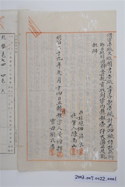 立轉借銀字人黃煌輝。情因堂叔黃清華有胎借契卷地番為憑,其業坐落土名北勢庄。經土地調查,地番一七四番:原野壹甲弍分九厘七毫,地番一八二番:池沼七厘叁毫,地番一八0番:池沼弌叁分弍厘四毫五絲,地番一八一番:田壹甲六分五厘四毫五絲,地番一七九番:畑九厘六毫五絲。今因乏銀應用,□□此業轉借為胎,托中說合,向得黃琳德、黃□德、黃阿芳手內借出龍銀壹仟大圓正。當日言定,每元每年應貼利谷五升,歷年計共利谷伍拾石正,換算官定斗弍拾捌石五斗正。限至早季收成之際,經對現佃在埕,交納清楚,不得濕冇抵塞,亦不得拖欠升合,如有少欠升合,任從為胎轉借之業,听銀主起耕出贌收租抵□,煌輝不敢異說。其銀面約,不拘年限,若要還銀,六月必先送過定額□銀壹佰大圓,銀期至十月中,銀齊到、字交還,兩不得異言。此係仁義交關,各無反悔,今欲有憑,立轉借銀字壹紙,並繳黃清華借字壹紙,又繳鬮書壹紙,上手印契壹紙,計共四紙,付執為炤。