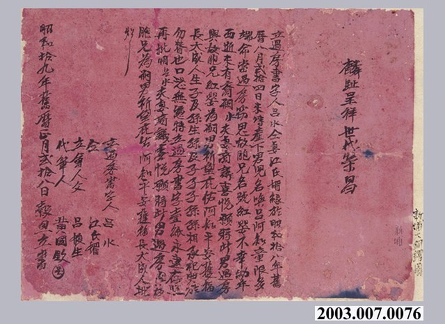 2003.007.0076 昭和19年呂水仝妻江氏媚立過房書