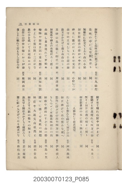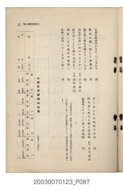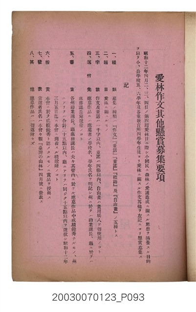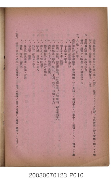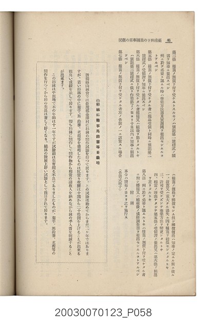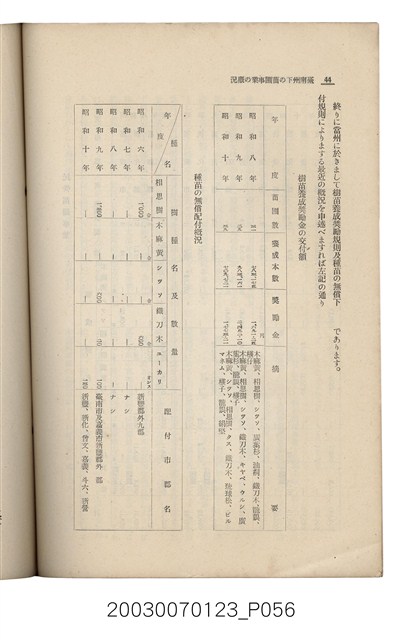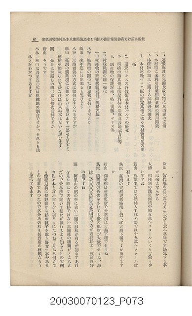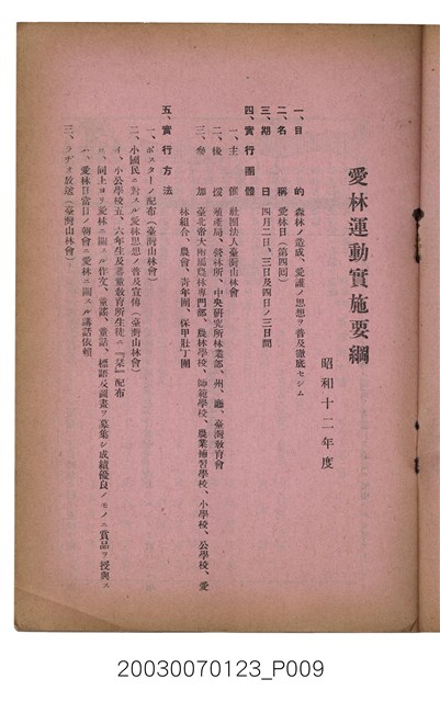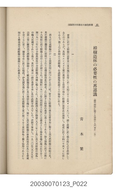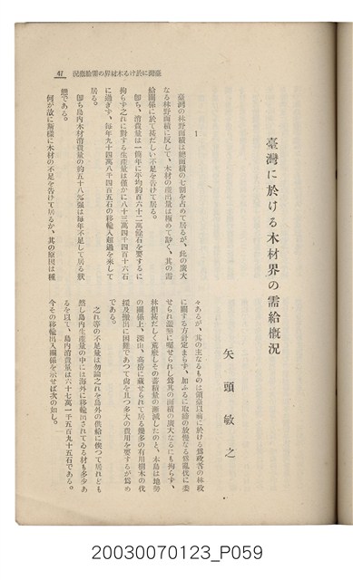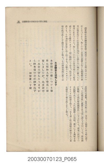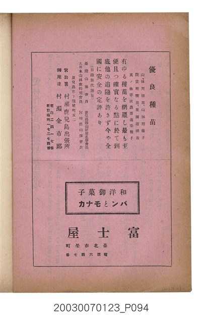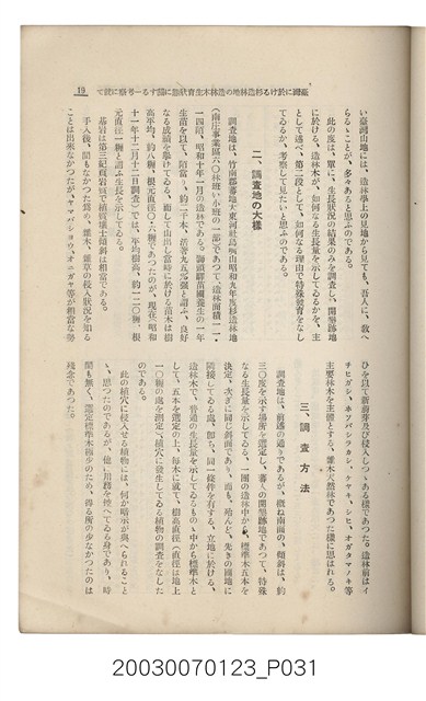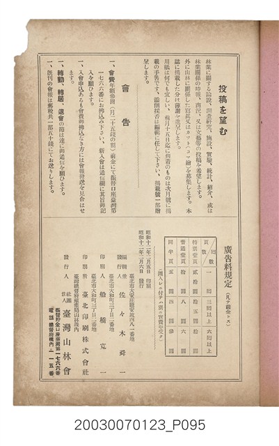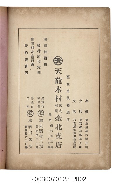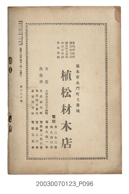 1. 本書為社團法人臺灣山林會所發行的《臺灣的山林》,內容主要收錄了許多日本學者針對臺灣的山林地區、林業、公園事業、礦業等領域的研究發表文章。本書於昭和12年2月6日發行,為每月初發行的刊物;此為第130號。本期刊登了新竹州殖林週間的行事曆,其中包括林業に關する學術研究發表會、視察旅行地案內、愛林運動實施要綱等。其所收錄的文章有:卷頭言:第一回山林會大會に就て、臺灣に於けるマギ造林、樟樹造林の必要性の再認識、天然樟樹保護林に就て、臺灣に於ける杉造林地の造林木生育狀態に關する一考察に就て、臺南州下の苗圃事業の概況、臺灣に於ける木材界の需給概況、最近に於ける森林施業計畫の傾向と本島施業案及本島林業發展私案、阿玉山登行記等。內含多則廣告,例如:天龍木材株式會社臺北支店、荒井商店、原川運送本店、官公署村瀨鹿兒島出張所(優良種苗)、富士屋和洋御菓子、植松材木店等。