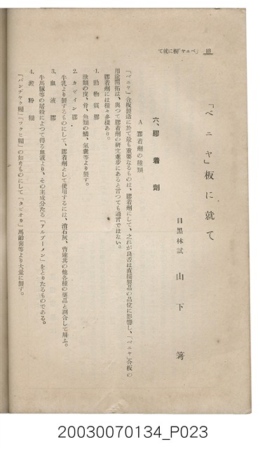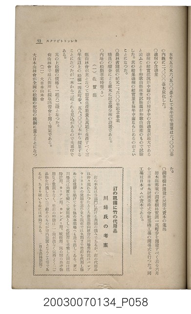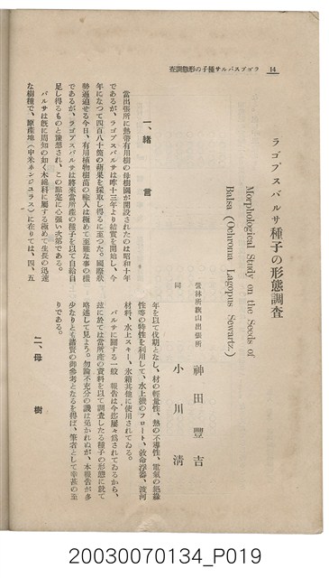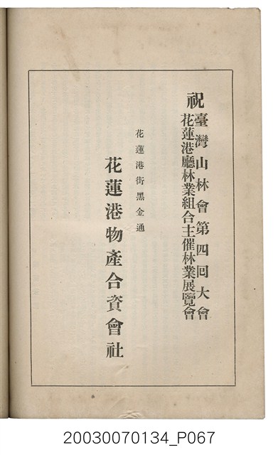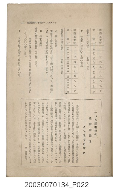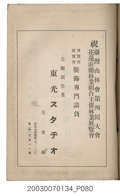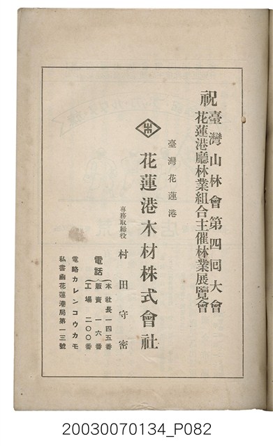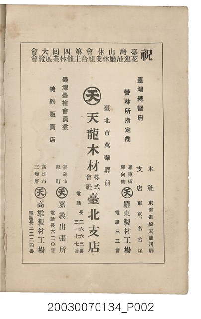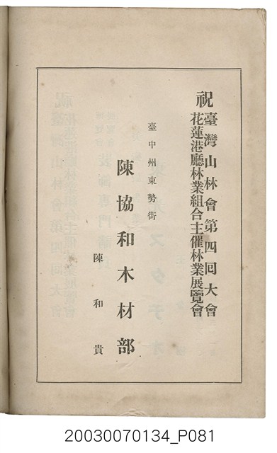 1. 本書為社團法人臺灣山林會發行的《臺灣的山林》,內容主要收錄了許多日本學者針對臺灣的山林地區、林業、公園事業、礦業等領域的研究發表文章。本書於昭和14年8月10日印刷及發行,為每月初發行的刊物;此為第160號。除了卷頭言:體位向上與登上,另外收錄了十一篇文章:相思樹の樹皮率た就て、 ラゴプスバルサ種子の型態調查、ベニヤ板に就て、青年團植林報國運動に就て、改正森林法、バルサの辯、カレソト・トビツクス(二)、山林獨語(十二)、臺灣に於ける松脂採取試驗の二三に就て、調查の屑籠及興亞展に遣して。其中也刊登了多則廣告及臺灣山林會第四回大會暨花蓮港廳林業組合主催林業展覽會之祝賀啟事,例如:天龍木材株式會社臺北支店、植松材木店、東光スタヂオ、陳協和木材部、花蓮港木材株式會社、荒井商店、官公署村瀨鹿兒島出張所(優良種苗)等。