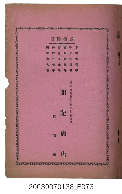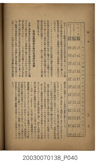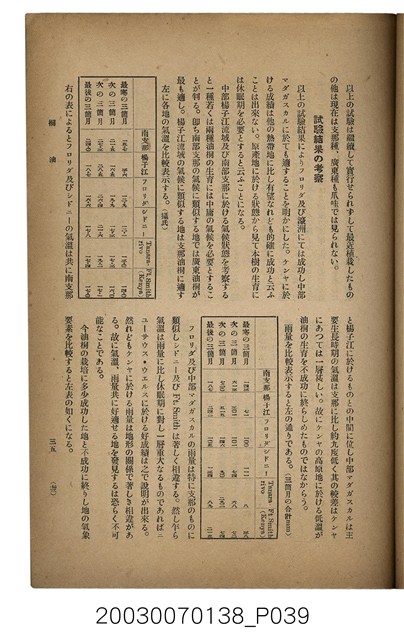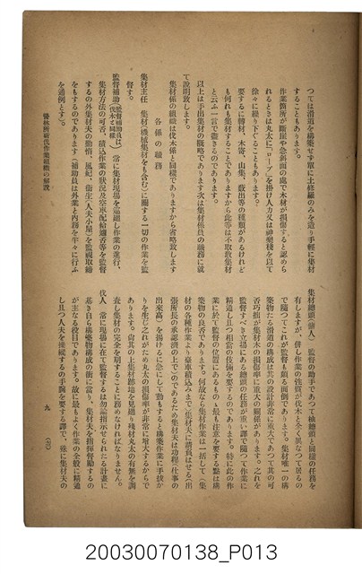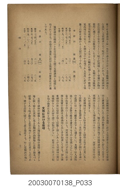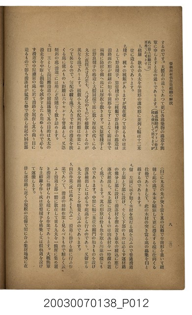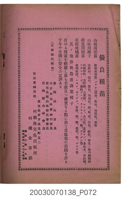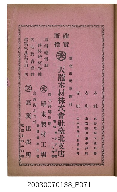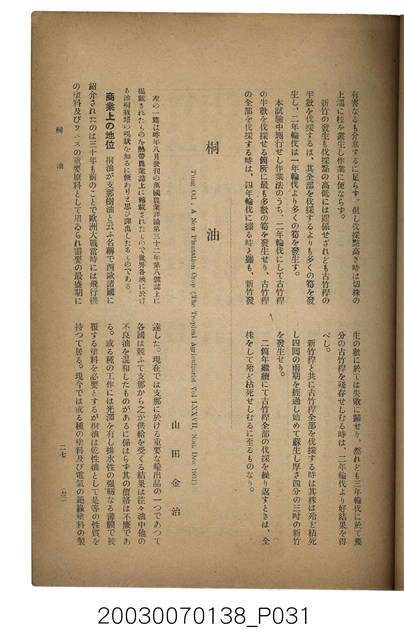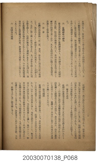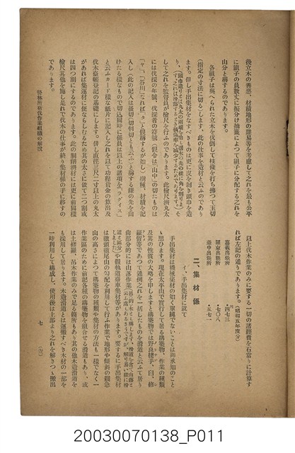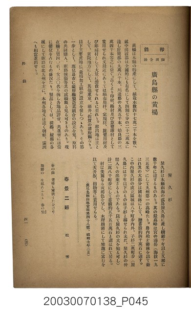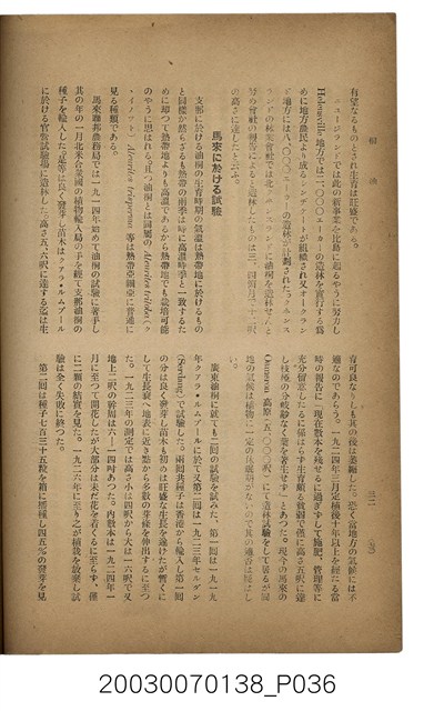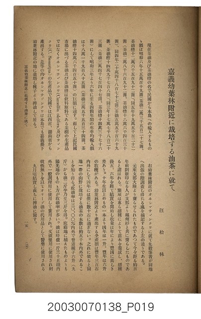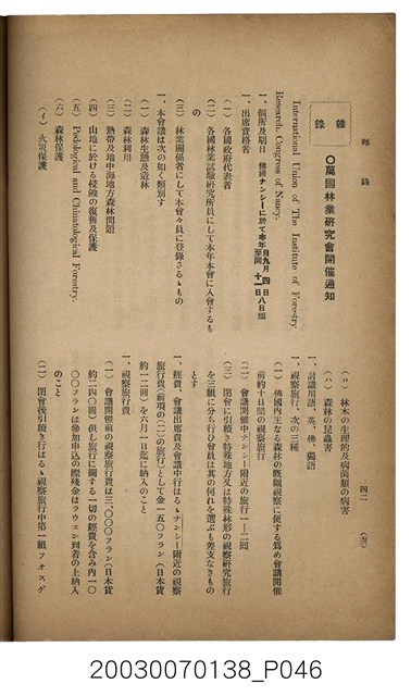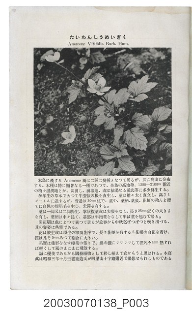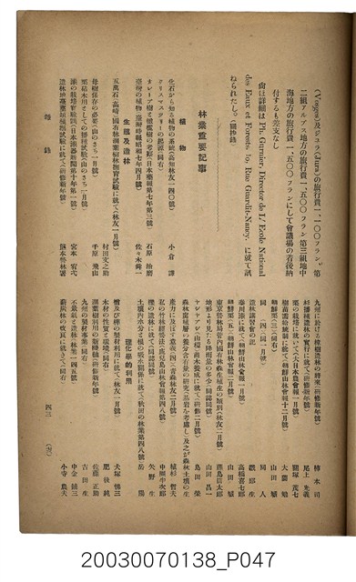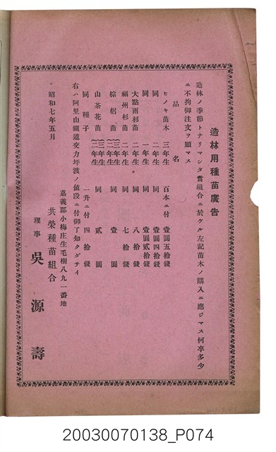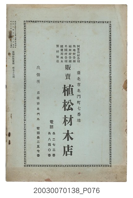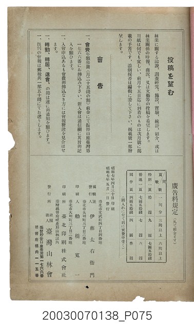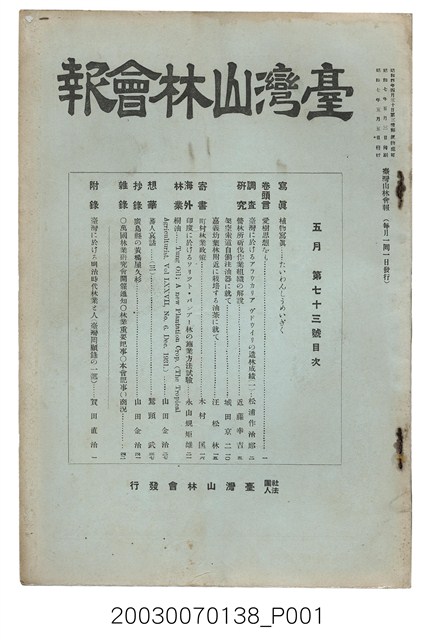 1. 本書為社團法人臺灣山林會發行的《臺灣山林會報》,內容主要收錄了許多日本學者針對臺灣的山林地區、林業、公園事業、礦業等領域的研究發表文章。昭和7年5月5日發行,為每月初發行的刊物;此為第73號。目次:寫真-植物寫真……たいわんしうあいぎく;卷頭言-愛書思想をも;調查-臺灣に於けろアラウカリアヴドウイリの造林成績(一);研究-營林所砍伐作業組織の解說;架空索道自動注油器に就て;嘉義幼葉林附近に栽培すろ油茶に就て;寄書-町村林業政策;海外-印度に於けろソリツト·バンブ-林の施業方法試驗;林業-桐油……T’ung Oil; A new Plantation Crop. (The T’ropical Agriculturist. Vol. LXXVII, No. 6. Dec. 1931.);想華-蕃人哀話(三);抄錄-廣島縣の黃楊屋久衫;雜錄-萬國林業研究會開催通知;附錄-臺灣に於けろ明治時代林業そ人(臺灣回顧錄の一部)