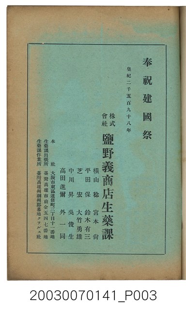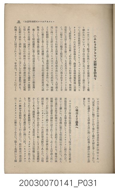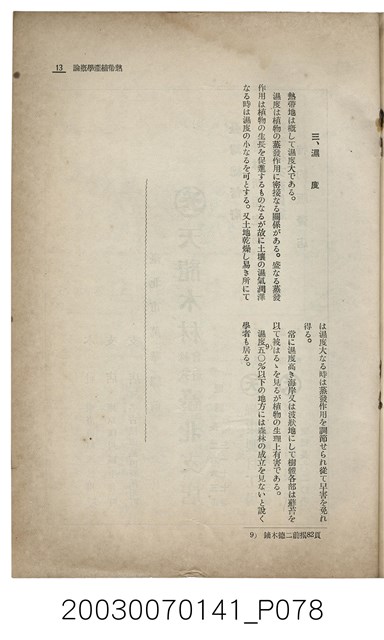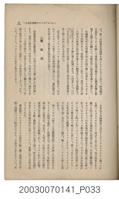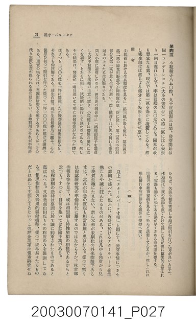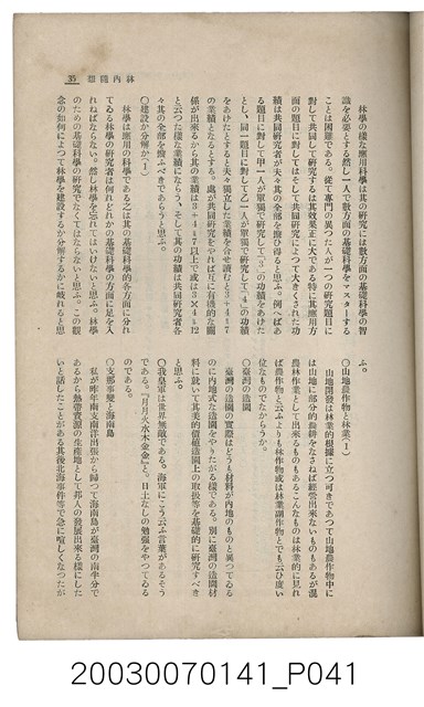 1. 本書為社團法人臺灣山林會發行的《臺灣的山林》,內容主要收錄了許多日本學者針對臺灣的山林地區、林業、公園事業、礦業等領域的研究發表文章。本書於昭和13年1月5日印刷及發行,為每月初發行的刊物;此為第142號。除了卷頭言:新規事業につい偶感,另外收錄了十二篇文章:華北の經濟與其前途、海岸沙防造林苗圃事業に就て、ナタlルバlク寸報、ニヒタカアカマツ天然林を訪ねて、北港郡耕地防風林道路並木品評會視察記、林內隨想、森林治水事業地活動寫真巡寫記、詩藻:松明の如く、詩藻:慌れ行く山を治せ、山林俳壇、主要林產物貿易月報、寄贈圖書、編輯室より、本會記事及熱帶植產學概論(二)。