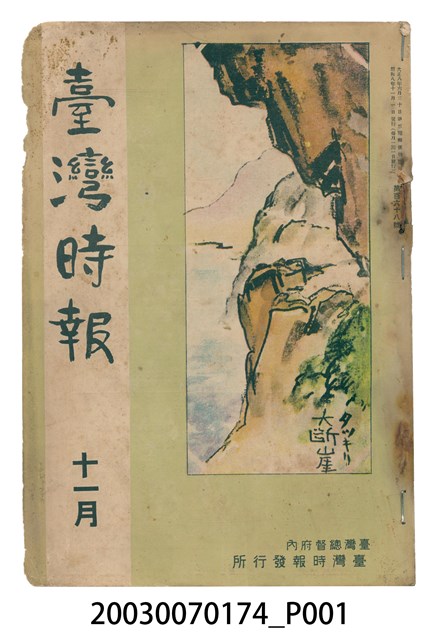 此為一紙質雜誌,並在封面左方寫有本雜誌的標題以及該雜誌的期號,右下方則有細長字體標明此物件的出版者,而封面右邊則畫有斷崖插圖。此書為臺灣總督府內臺灣時報發行所1933年出版之《臺灣時報》十一月號。 《臺灣時報》為1919年創辦的日文雜誌,1945年停刊。主要刊載內容有教育、司法、文藝、農產、貿易等各個面向的論文,本書便是其中之一。此刊物的前身可追溯至日本治臺初期的殖民研究計畫,即1898年由「臺灣協會」發行的機關刊物《臺灣協會會報》。