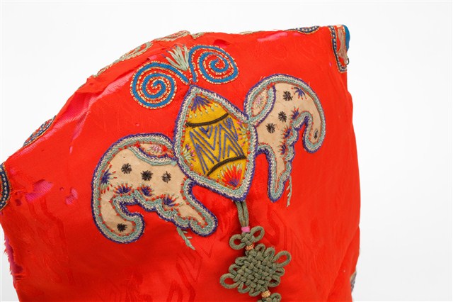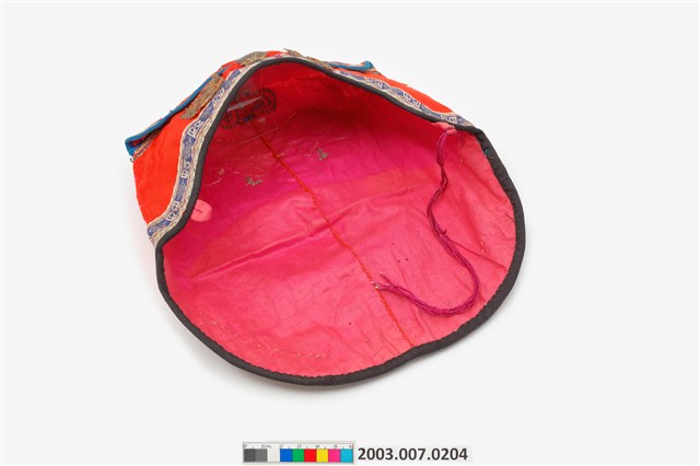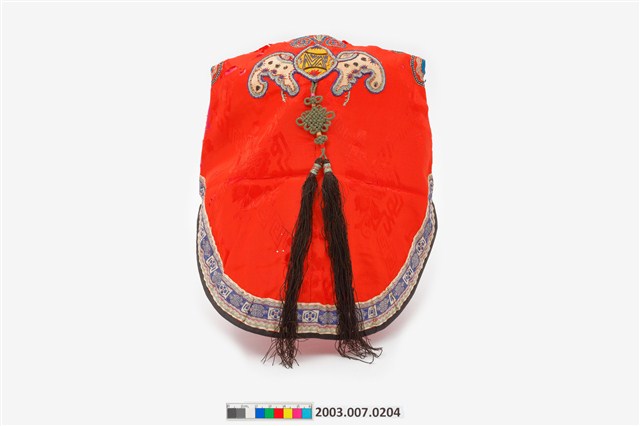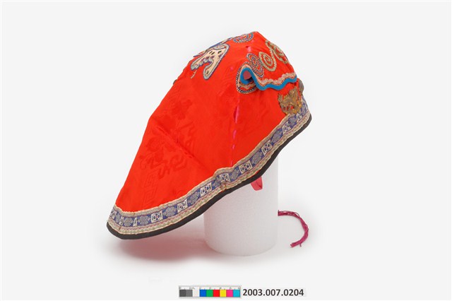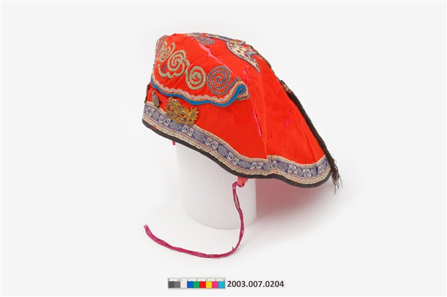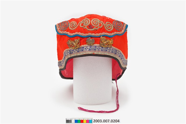 2003.007.0204 大紅地盤金繡鑲雙龍戲珠帽花風帽
