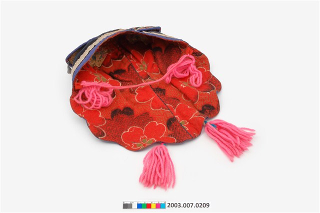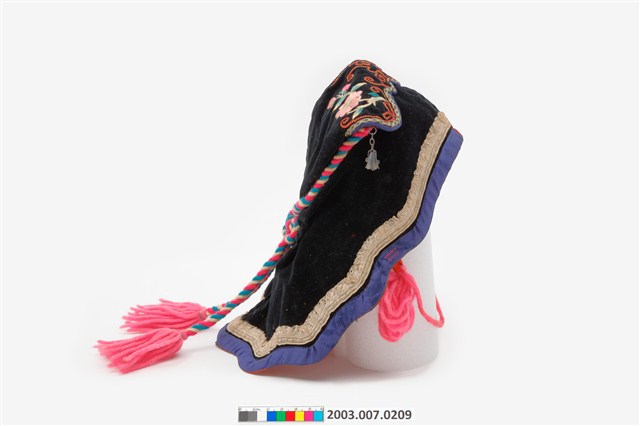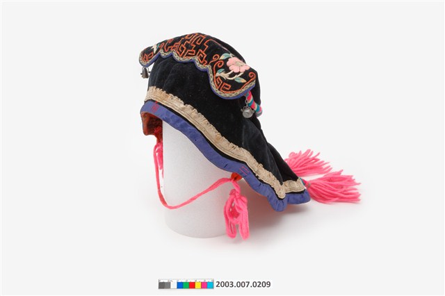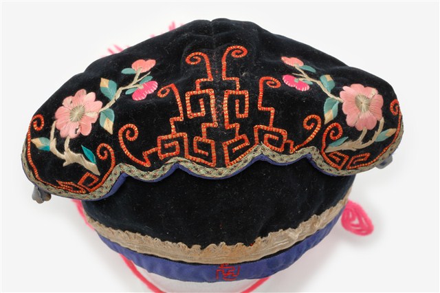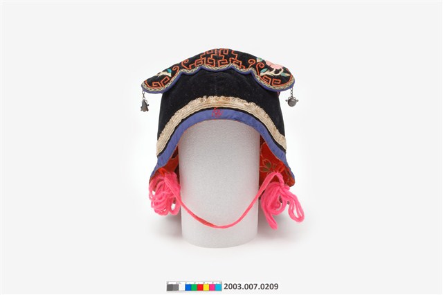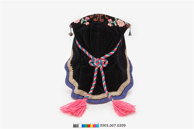 2003.007.0209 黑地彩繡盤長花卉紋風帽
